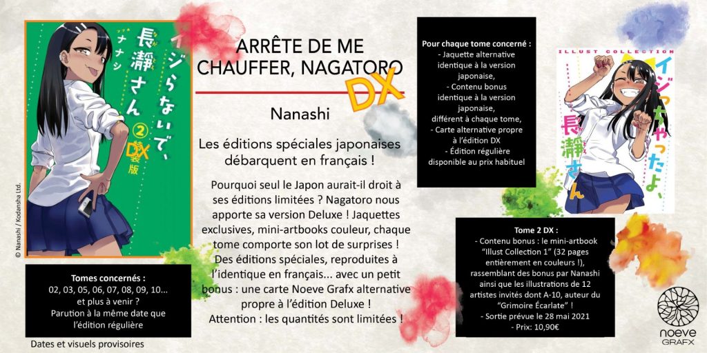 - enfin, les tomes qui ont connu une version « collector » au Japon, auront droit à cette même version collector, mais en VF ! Il s’agira des tomes dits Deluxe, ou DX en abrégé, qui proposeront a priori stricto sensu (trop de locutions latines là…) le même contenu que leurs homologues japonais, mais localisés. Si le collector existe au Japon, il sera en France. S’il n’existe pas, et bien il n’y en aura pas en France non plus. Ce tome DX sera bien évidemment un poil plus cher. Voici par exemple ce que l’éditeur annonce pour le tome 2 DX de Nagatoro: